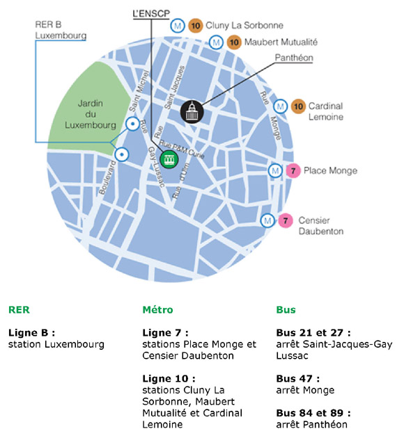 It will take place in the center of Paris, at the Ecole Nationale Supérieure de Chimie de Paris (ENSCP), 11, rue Pierre et Marie Curie, 75005 Paris. ENSCP is situated within the Latin Quarter between the Luxembourg Garden ("Jardin du Luxembourg") and the "Pantheon". It can directly be reached from the two Paris airports (Orly and Charles de Gaulle) as well as from the northern and eastern railway stations ("Gare du Nord" and "Gare de l'Est") by the fast subway train named "RER B ".